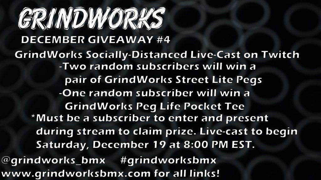 Return to the Twitch channel on Saturday, December 19 and hang in the Discord chat to be a part of the next GrindWorks Live-Cast. Giveaways will be periodically throughout the cast, so you’ll want to get comfy and hang out for a bit! You will need to be present in chat to claim your prize.